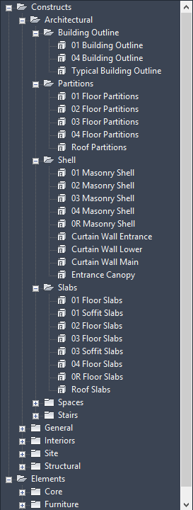 The Drawing Explorer is a tree view common to the Constructs, View, and Sheets tabs of the Project Navigator. This is where the drawing files are organized. Each tab of the Project Navigator except the Project tab has a Drawing Explorer tree where the associated project drawing files—elements, constructs, views, and sheets—are displayed.