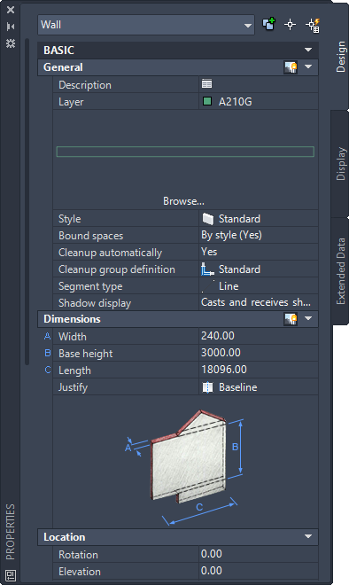 Properties Palette for a standard wall object