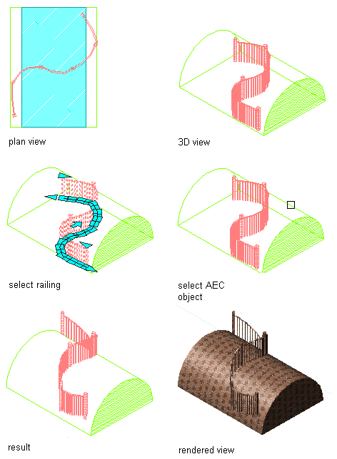 Use this procedure to anchor an existing railing to an AEC object other than a stair. Once attached, the railing stays where it is located in the drawing, but it moves when the attached object is moved. This allows you to create free-form paths for a railing along a stair or other object.