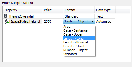 When a property definition is first inserted in a formula, its sample value is taken from an object in the current drawing that uses the formula’s property set definition or from a default object.