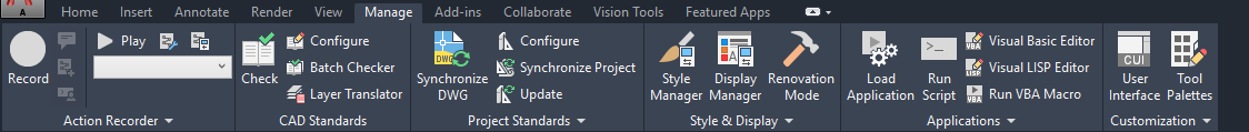 - Project Standards. Contains commands associated with project standards for an AEC project. You can configure project standards, synchronize the project with its standards, synchronize standards with each other, and audit projects and drawings.
