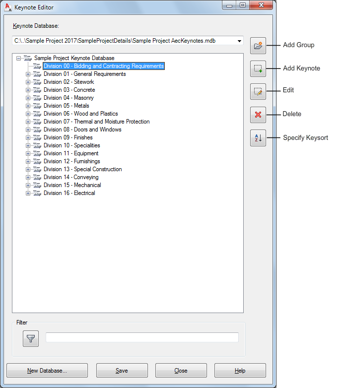 The Keynote Editor is a standalone application that lets you create and modify keynote databases. Accessed from the CAD Manager menu, the Keynote Editor dialog box provides a hierarchical tree view of the currently selected database, which displays as a root node. For an existing database, you can expand the root node to display groups, and then expand group nodes to display sub-groups or individual keynotes. Alternatively, you can enter text into the Filter box below the tree view. Clicking the Filter button, pressing Tab, or pressing Enter expands all nodes under any node whose name includes the text you enter.
