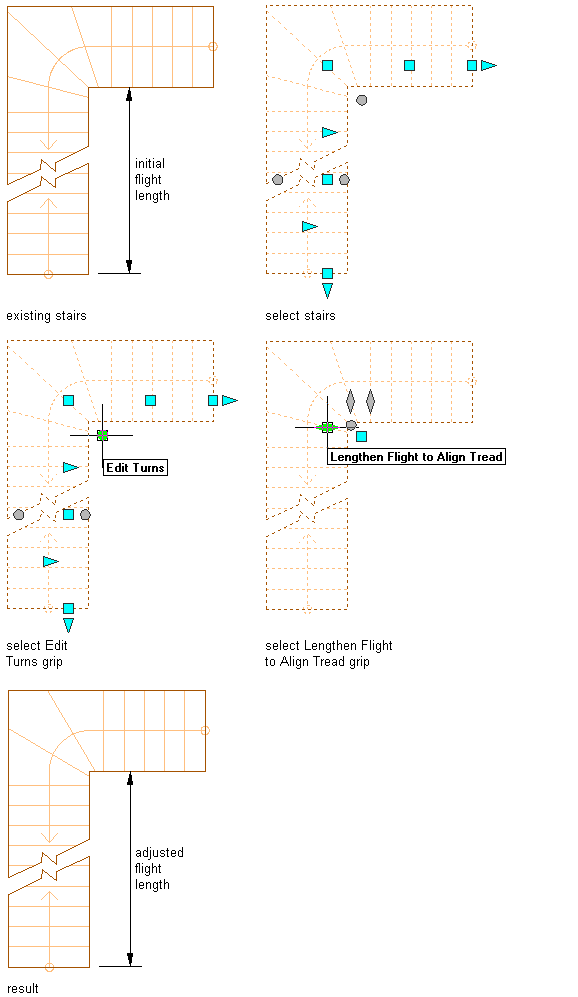 - When you have finished editing the flight length, you can click the Exit Edit Turns grip to return to the default stair edit mode, or right-click and click Deselect All to turn off grips.