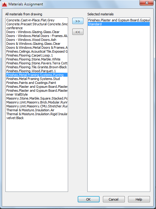 - Lists all AutoCAD defined materials which are available in the drawing.