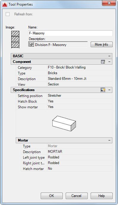 The appearance of the Tool Properties worksheet varies depending on the type of component and the current configuration of property settings. The following illustrations show two configurations of the Tool Properties worksheet for the 04 - Masonry tool that is included on the sample Basic tool palette. The tool is set to add standard 3/8” joint brick in both cases, but the first configuration has the View property set to Section, while the second has this property set to Elevation (Pattern). For detail components that can be oriented differently in different views, the View setting determines the particular drawing routine used to insert the image into the drawing. Note that the different View settings result in different orientation illustrations on the worksheet. Note also that the Mortar specifications are not applicable for the Elevation (Pattern) setting and are not displayed for that configuration. The properties displayed under Specifications may also vary depending on other settings. For example, if the Show Mortar property is No when the View setting is Section, no other Mortar properties are displayed. For some detail components, no Specifications apply, and the heading is not displayed.