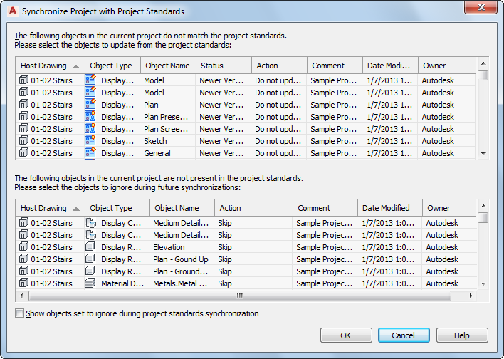 In this case, the inconsistent object will not be listed again in future synchronizations, except if you select Show objects set to ignore during project standards synchronization, or remove the Ignore flag from the style or display setting in Style Manager or Display Manager, as described in To Exclude Styles and Display Settings From Synchronization.