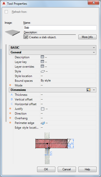 Note: Slab edge styles can not be applied as a part of the slab style definition; instead you can apply them as a palette-based tool property. Many of the slab styles included in the sample content files that ship with AutoCAD Architecture toolset indicate in their names a specific slab edge style and when a tool is created from those styles, the slab style is already assigned to the tool properties. These styles originated in an earlier version of the software in which default slab edge styles could be assigned to a slab style. This capability was removed from the User Interface of the slab style editor, however the style properties were left in those sample styles.