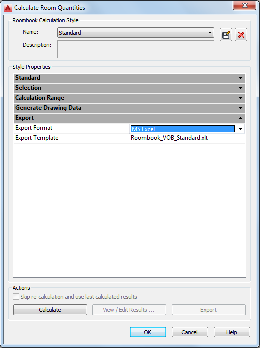 Roombook has predefined MS Excel export forms for each calculation standard which lists all calculated room quantities structured on one sheet.