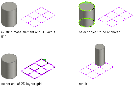 Note: There is no rule that determines which cell the object attaches to when you anchor it. You can turn on the Node display component to display the cell nodes of the layout grid or volume for easier cell selection. You can also move the object after you anchor it to the layout grid or volume.