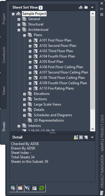 Sheet set, sheets, sheet views, sheet drawings, and model space views are listed on the Sheets and Views tabs of the Project Navigator.