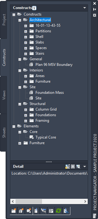 To help organize the building, components of the building project—constructs, views, and sheets—can be categorized. You can use categories like shell, core, and interior partitions. Categorizing a construct lets you filter that construct when generating views.