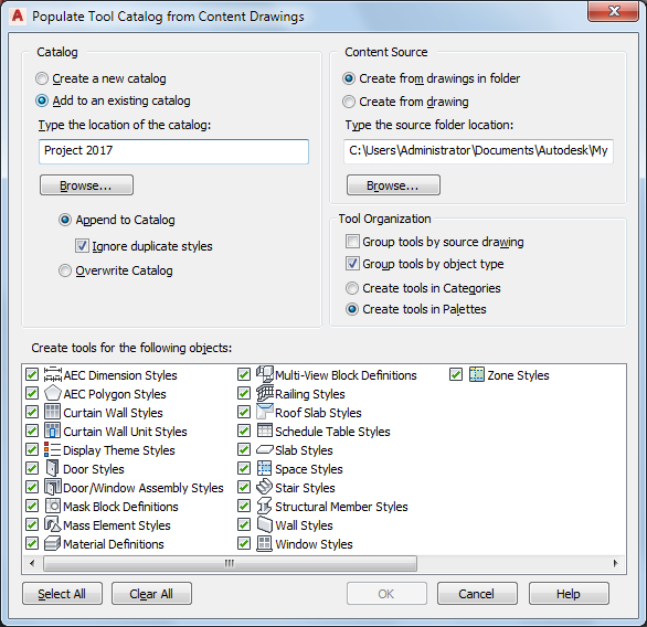 | organize the resulting tools by their source drawing | select Group tools by source drawing. This option is well suited for a tool catalog that is generated from a number of styles drawings. The resulting tools could be placed in categories or palettes named “Wall Styles - Concrete (Imperial),” “Wall Styles - CMU (Imperial),” and so on. |