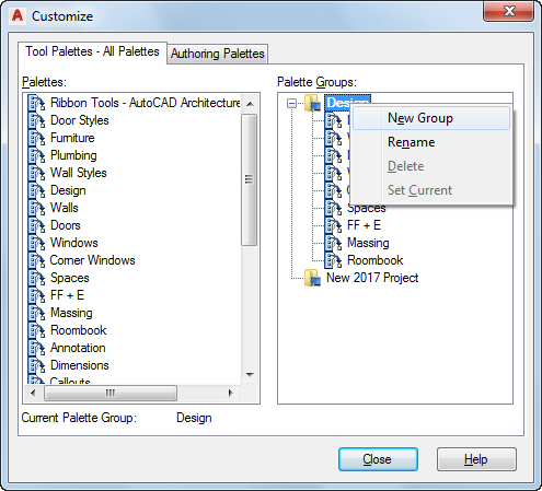 Tip: The Customize dialog box can be very useful for adding palettes to project palette groups.