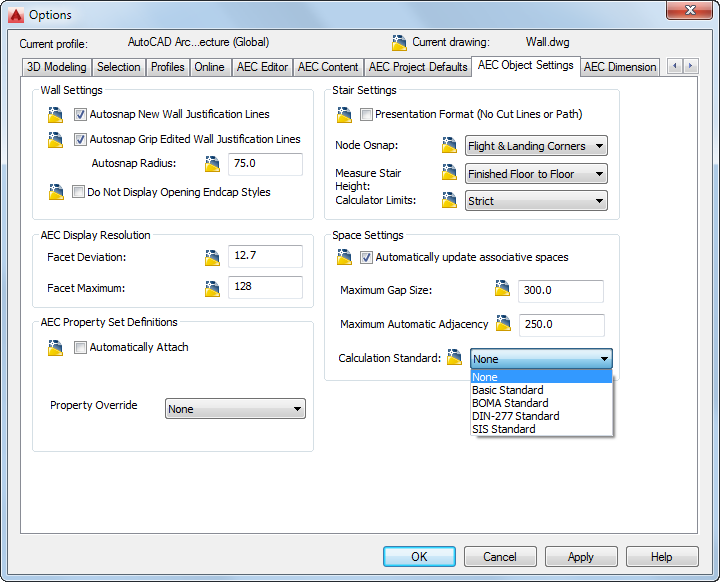 The following example shows the call for the sample project AecSpaceOffsetStandardSample which registers itself in the software as the Basic area calculation standard.