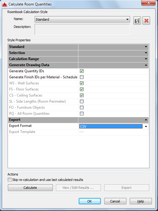 Starts the export process. The CSV export generates one file for each room quantity category. Each file is prefixed with the name of the drawing and the name of the Roombook calculation type.