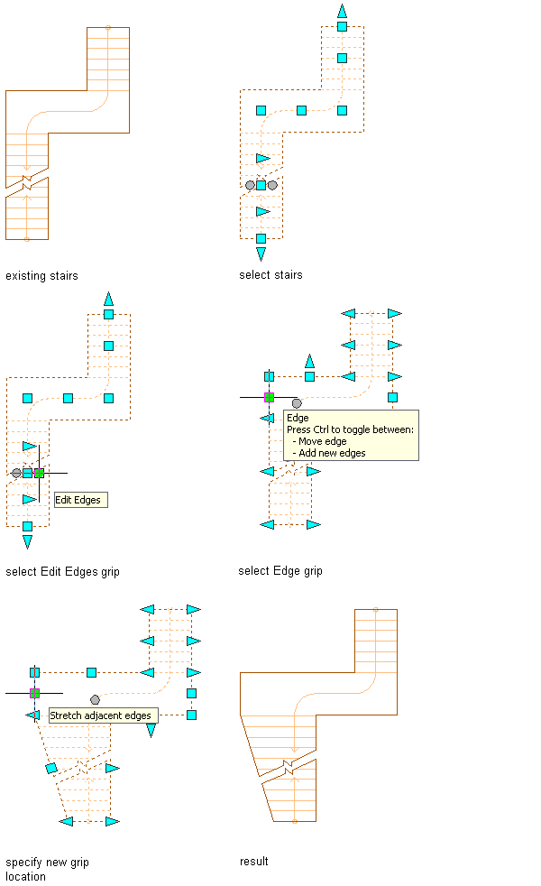 Pushing one tread into the landing with its grip forces the landing to lengthen in the other direction. Pulling one tread away from the landing does not affect the other end of the landing. The stair is lengthened at its top to accommodate the larger landing. You can modify the length with the top and bottom grips, at the end of the stair walking path.