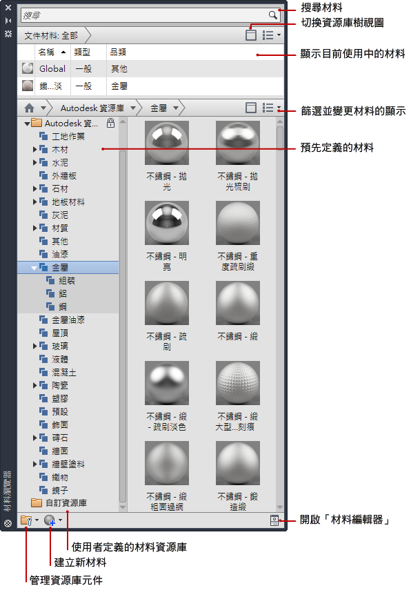 - Autodesk 資源庫。包含預先定義材料,適用於支援該材料的 Autodesk 應用程式。雖然您無法編輯 Autodesk 資源庫,但可以將這些材料當做自訂材料的基礎,然後再儲存於使用者資源庫。