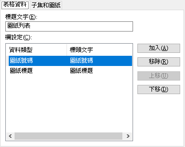 在圖紙列表中顯示欄定義清單。清單中的每一行都代表一個欄。由上到下的清單順序表示欄在表格中顯示的方式 (從左到右)。