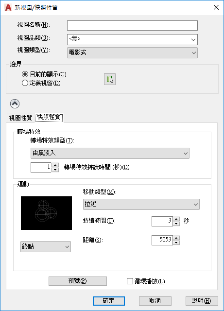 當具名視圖指定「電影式」視圖類型時,設定用於具名視圖的移動的類型。