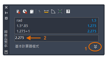有一個特別好的功能是「貼上值」,此功能會將目前的計算器結果複製到「指令」視窗中的提示。可以是計算的半徑、距離或偏移值。
