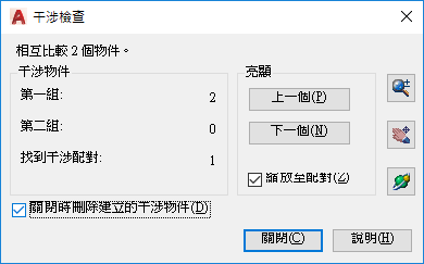 如果選取了該選項,則會關閉該對話方塊並刪除干涉物件。