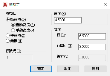 MTEXT (指令) 查找:「文字編輯器」頁籤 > 「插入」面板 > 「欄」 > 「欄設定」