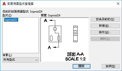 將在「型式」清單中所選的剖面視圖型式設定為目前型式。所有新剖面視圖都是使用此剖面視圖型式所建立。