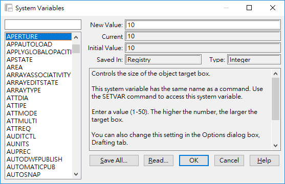| Initial Value | 顯示亮顯於清單方塊中系統變數的初始值。此即為新圖面中的系統變數值。 |