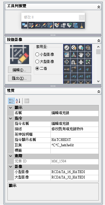 「動態顯示」窗格顯示在「自訂位置」窗格選取的使用者介面元素預覽。它可讓您編輯在「指令清單」窗格中選取的指令影像,以及在「自訂位置」或「指令清單」窗格中選取之項目所特定的性質。