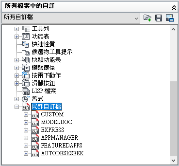 樹狀檢視用於建立並管理使用者介面元素。在建立使用者介面元素之後,您就可以將指令從「指令清單」窗格拖曳至元素中,以加入該指令。您也可以在樹狀檢視中向上和向下拖曳指令,以變更其在功能區面板或工具列等使用者介面元素的顯示順序。