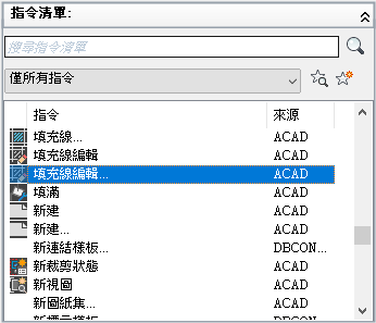 「指令清單」窗格包含可在目前載入的 CUIx 檔中使用的所有指令。您可以選取既有指令從清單以修改其性 質」或「建立新指令」。如果您想要建立新指令,指令會加入 CUIx 檔,並顯示在「<檔名> 中的自訂」窗格頂部附近的下拉式清單中。