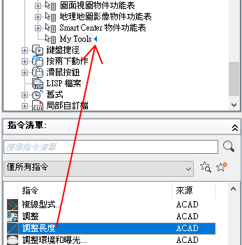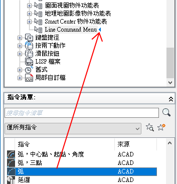 - 在「指令清單」窗格中,將要加入的指令拖曳至「<檔名> 中的自訂」窗格中的快顯功能表。