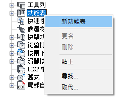 中的自訂」窗格內,於「功能表」節點上按一下右鍵。按一下「新建功能表」。