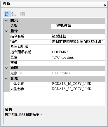 以下是在「複製連結」功能表項目的「名稱」性質加入一個波狀符號 (~) 之後,顯示在「編輯」功能表的結果。
