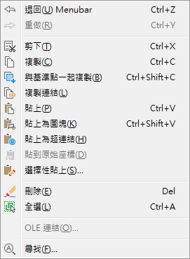 以下範例展示「編輯」功能表上具有勾選標記的「OLE 連結」功能表項目,以及周圍以邊框亮顯的「複製連結」功能表項目影像。