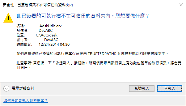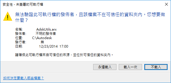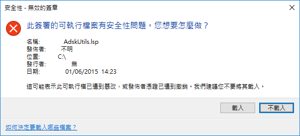當載入已數位簽署的自訂程式檔時,AutoCAD 系列程式會確認數位簽章是否已貼附至檔案。顯示的訊息方塊會指示數位簽章是否可驗證,以便使用者決定是否要將程式檔載入圖面環境。