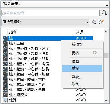- 在「自訂」頁籤的「指令清單」窗格中,尋找您要複製的指令。