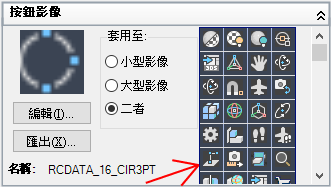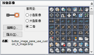 在「按鈕影像」窗格中的「套用至」下,選取以下三個影像指定選項之一:「小型影像」、「大型影像」或「二者」。然後選取您從影像清單匯入的影像。