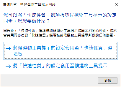 如果已勾選「自訂與屬性」品類,動態的性質和屬性圖塊會顯示在「快速性質」選項板。