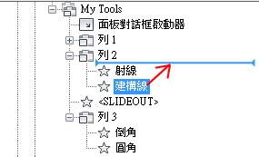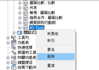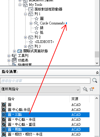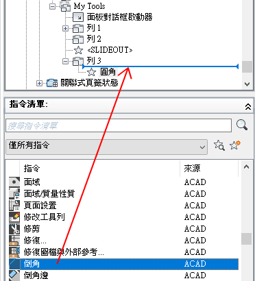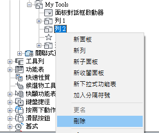 - 將新功能區面板從右側「<檔名> 中的自訂」窗格拖曳至左側「<檔名> 中的自訂」窗格中已載入 CUIx 檔的「面板」節點。