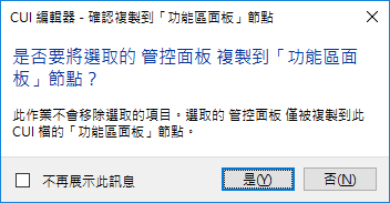 - 在「CUI 編輯器 - 確認複製到『功能區面板』節點」對話方塊中,按一下「是」。