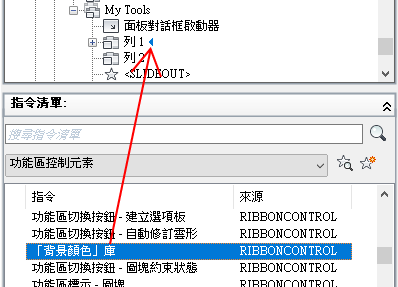 - 將指令從「指令」清單拖曳至面板上的「面板對話方塊啟動器」。