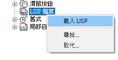 > 中的自訂」窗格內,於「LISP 檔」節點上按一下右鍵。按一下「載入 LISP」。