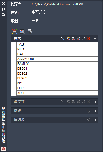 在自訂符號中加入屬性「標籤 1」、「描述 1」、「位置」、「安裝」、「族群」、「製造商」、「目錄」和「配件代碼」。