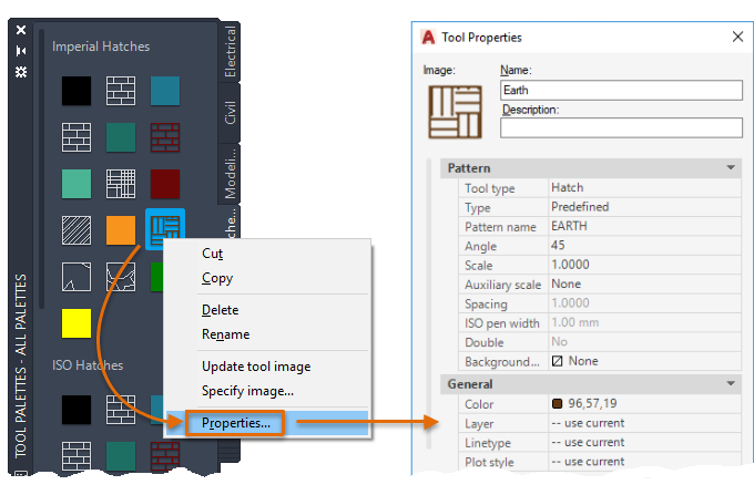 在工具選項板中加入工具之後,您可以變更其預設性質。例如,您可以變更圖塊的插入比例或填充線樣式的圖層。