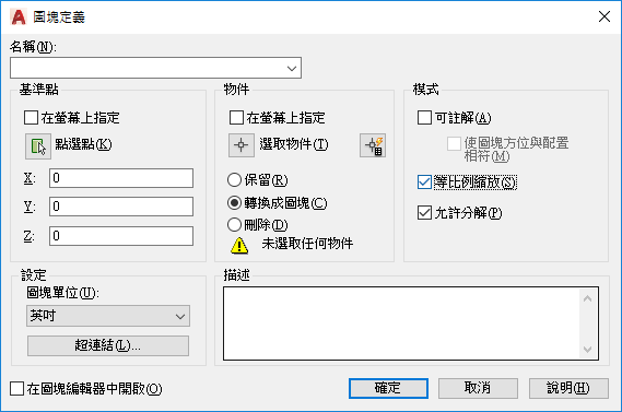 指定要併入新圖塊的物件,以及是否要保留或刪除選取的物件,或者是否在建立圖塊之後將它們轉換成圖塊例證。
