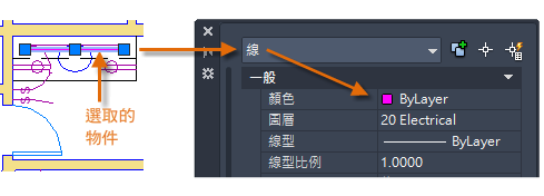 請注意,選取物件的目前性質會在「性質」選項板中顯示。您可以按一下並變更性質設定來變更所有這些性質。設定為「依圖層」的性質會繼承其圖層的設定。上一個範例中,在 20 ELECTRICAL 圖層上建立的物件為紫色,因為這是該圖層物件的預設顏色。