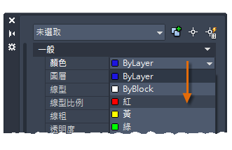 「性質」選項板可顯示所有重要性質設定清單。您可以按一下任何可用欄位以變更目前設定。在以下範例中,如果未選取任何物件,目前的顏色會從「依圖層」變更為「紅」。後續建立的所有物件都會指定為「紅」的顏色性質。