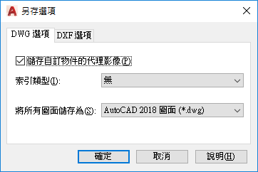 如果以舊版格式儲存,或者圖面包含其他應用程式的自訂物件,則選取「儲存自訂物件的代理影像」來儲存圖檔中自訂物件的影像。(PROXYGRAPHICS 系統變數)