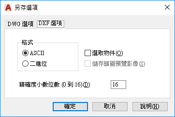 指定是否建立 ASCII 或二進位 DXF 檔。ASCII 格式的 DXF 檔案可在文字編輯器中讀取,並與一般的應用程式相容。二進位格式的 DXF 檔比較精簡。二進位格式檔的讀寫作業比 ASCII 檔的讀寫作業還要快速。